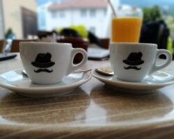 Terrassen Frühstück. Abschied von Anton 90. Bedeckt, trocken. Na bitte. Shuttle Gampenpass 100€. Rankepinio. Tolle Strecke. Ein zweimal ordentlich steil. Unterkunft Al Palazzo prima. Cles im Regen Nix neues also. Cappuccini hier und da. Spritz. Black Monster Bedienung. Pizza Katastrophe di Pommes Trentino 🙈. Noch mehr Espressi. Entspannung im Palazzo. Morgen geht’s zum Brenta Bike Trail.