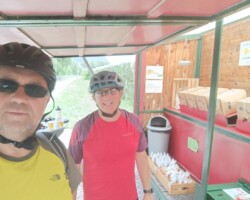 Top Frühstück. Nonne Barbara, auch top aber warum waren wir nicht gebucht? Wo war unser Namens Schildchen? Tolles Wetter. Schieben an der Fliesserplatte. Bremse quietscht. Eingestellt. Bremse quietscht. Eingestellt. Bremse quietscht. Quietscht. Schuhe bleiben still. Akku repariert mit Topfen Quarkkuchen. Schwerer Aufstieg zur Norberts Höhe. Geschmeidige Abfahrt. Selbes Zimmer. Flott fertig gemacht. Und auf zum EM Spiel Deutschland – Spanien. Leider verloren. Na ja…