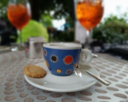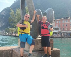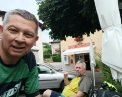 Terrassen Frühstück. Zeitgelassen. Abwechslungsreiche Tour. Espresso hier und da. Ein paar Anstiege und steile Rampen. Lago di Tenno. Bremse hinten bremst nicht mehr. Bremsbeläge runter. Nee, Bremskolben fest, zeigt sich aber erst daheim. Irgendwie geht’s noch bis ins Hotel. Bastion Riva. Aperol. Espressi, Aussicht. Abfahrt. Die letzten Kehren. Finisher Foto. Finisher Gelato. Finisher baden 🏊 im Lago. Hotel Holiday Sport & Relax prima. Pool schön. Nach Sport jetzt Relax Phase. Essen, schlafen, Ciao…